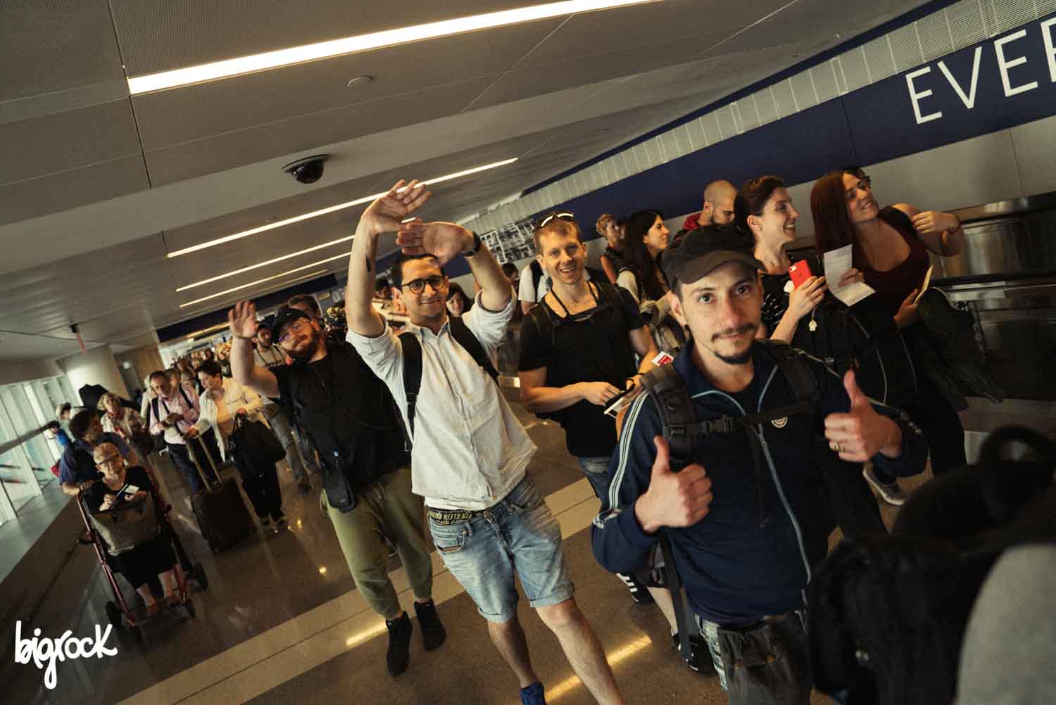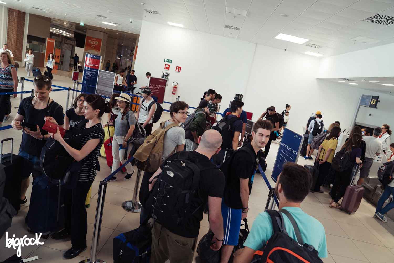 e qui, qualcosa ci insospettisce: praticamente usciamo dal’aeroporto, arriviamo davanti al checkin dove 5 addetti impazziti cominciano ad urarlare orari a caso, “chi è 7? chi 6.21 ?”.