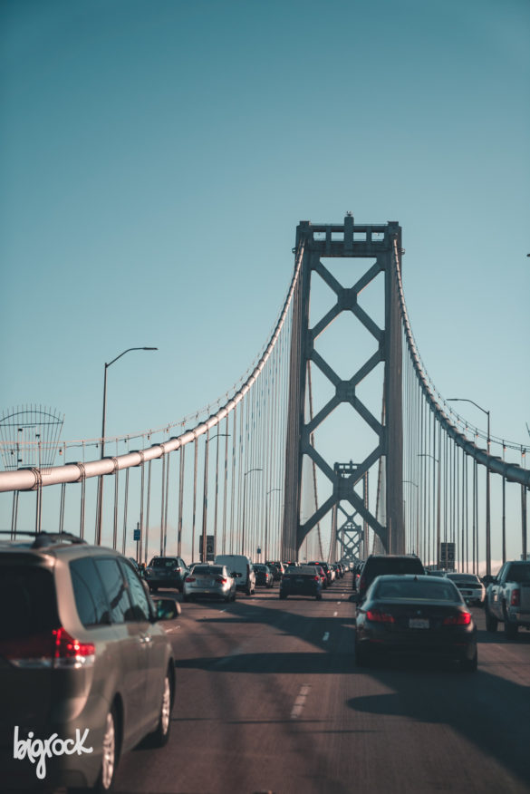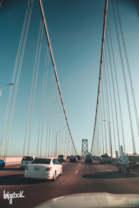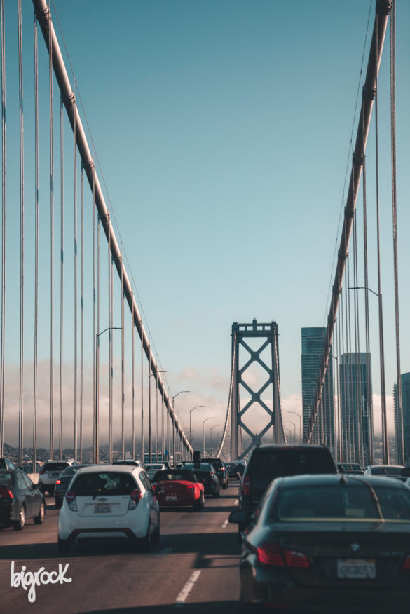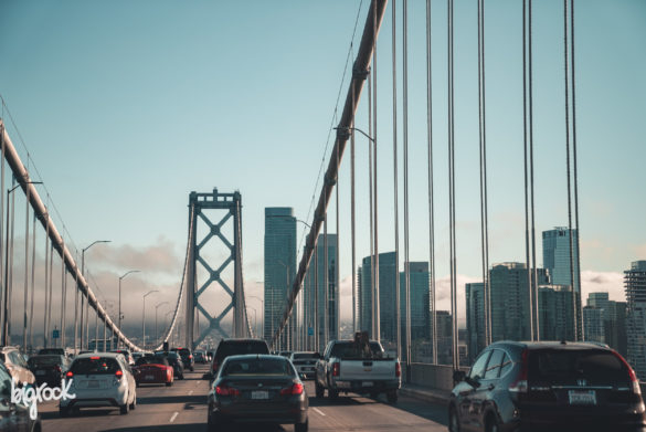 Il Bay Bridge di San Francisco ci accoglie con le sue nuvole trafitte dal sole del tramonto. Con la silhouette della città affacciata alla baia.