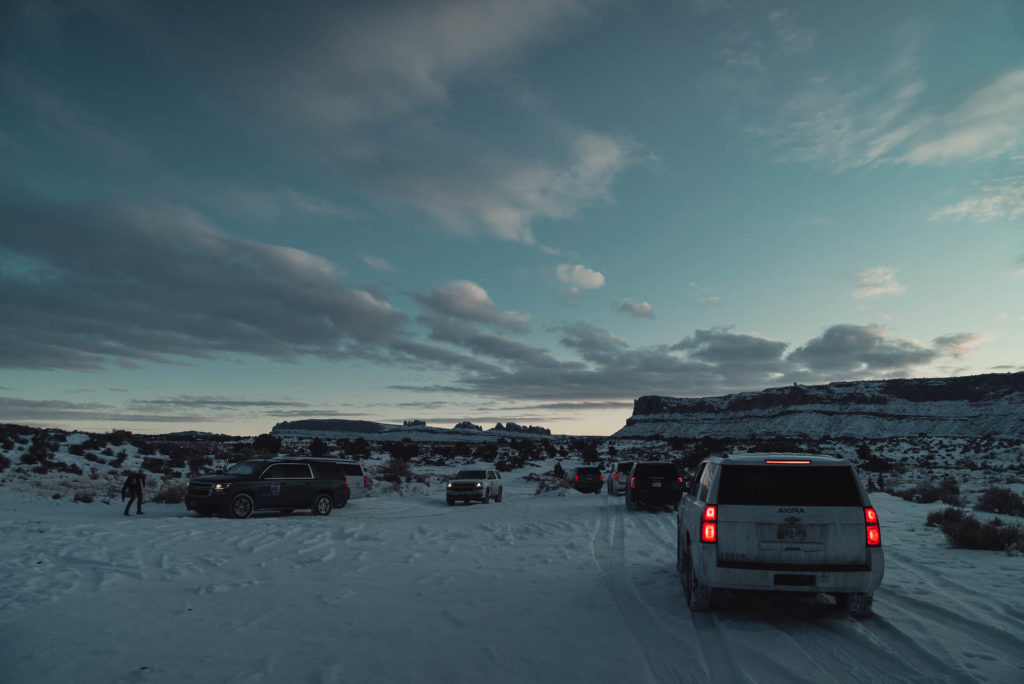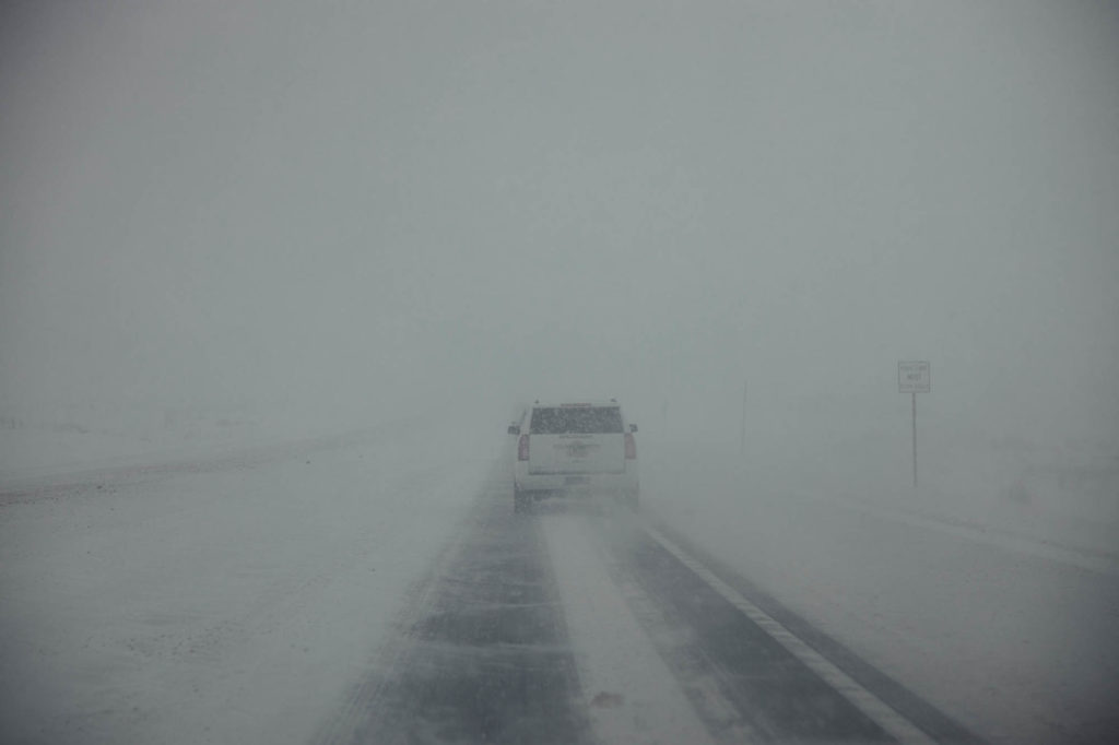 Il viaggio prosegue e la tormenta arriva anche su di noi, inesorabile, imbiancando strade, montagne, facendoci scomparire uno dall’altro in una nuvola ovattata. Corriamo piano, in fila, tenendoci in contatto radio per non perderci.