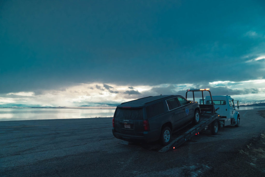 Ha qualcosa di romantico vedere il tramonto sul lago di Bonneville. L’acqua, in uno straordinario momento di poco vento, riflette precisamente il paesaggio creando un quadro meraviglioso di nuvole e colori nell’imbrunire. E vedere Akira, completamente inerme, venire trainata sopra il carro attrezzi, è estremamente drammatico.