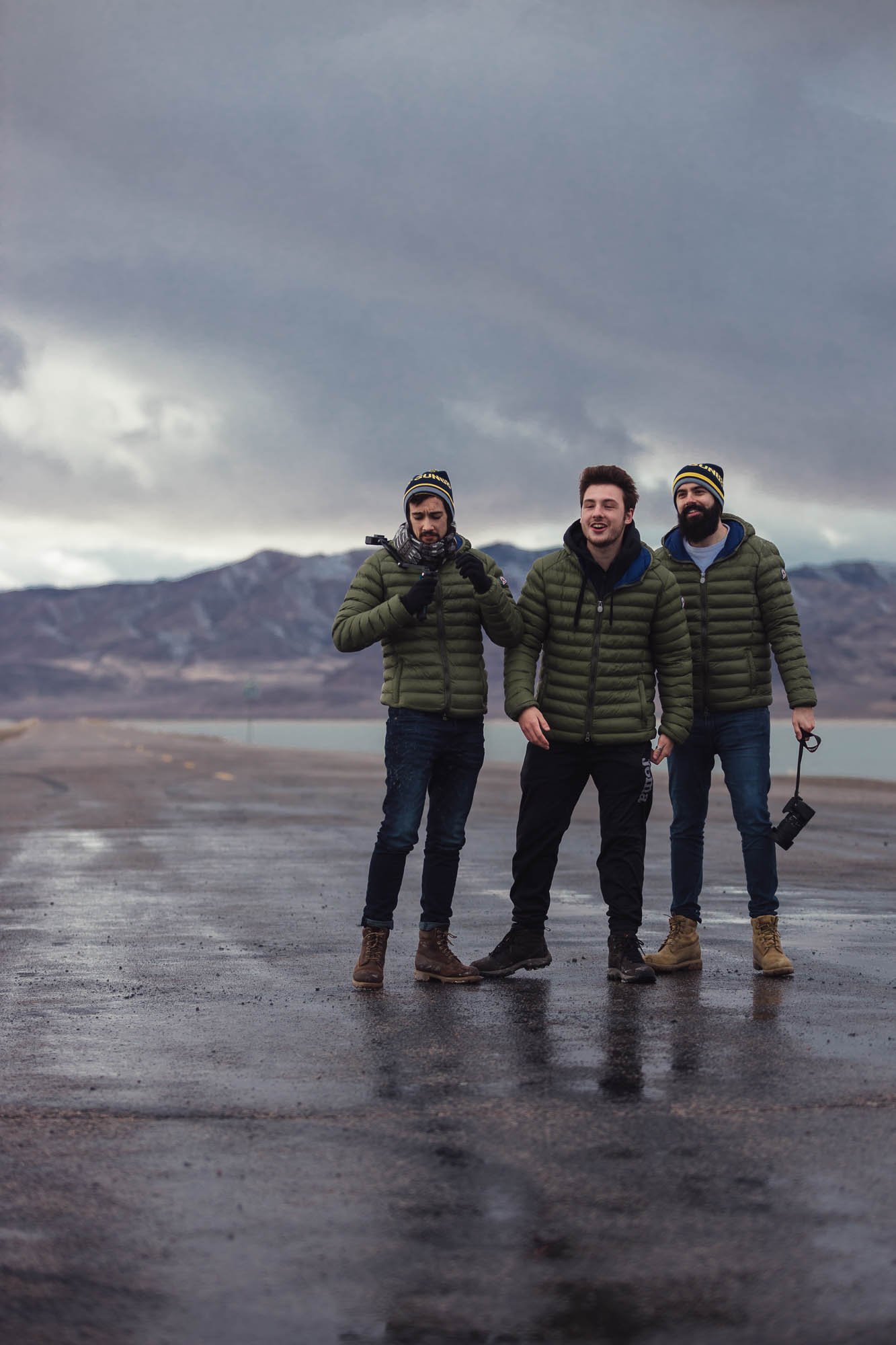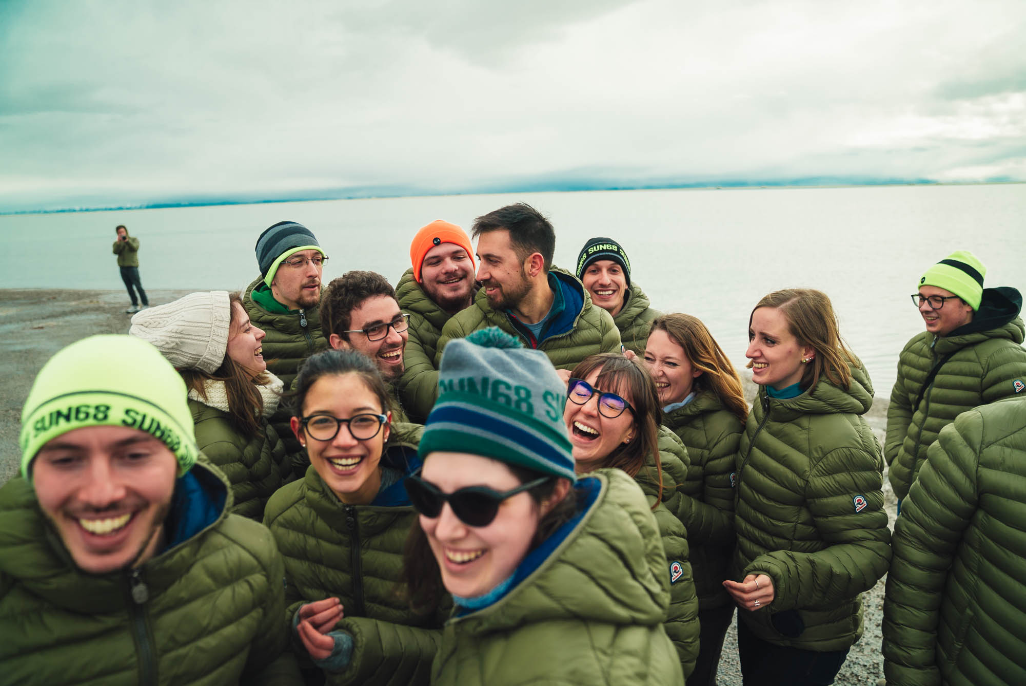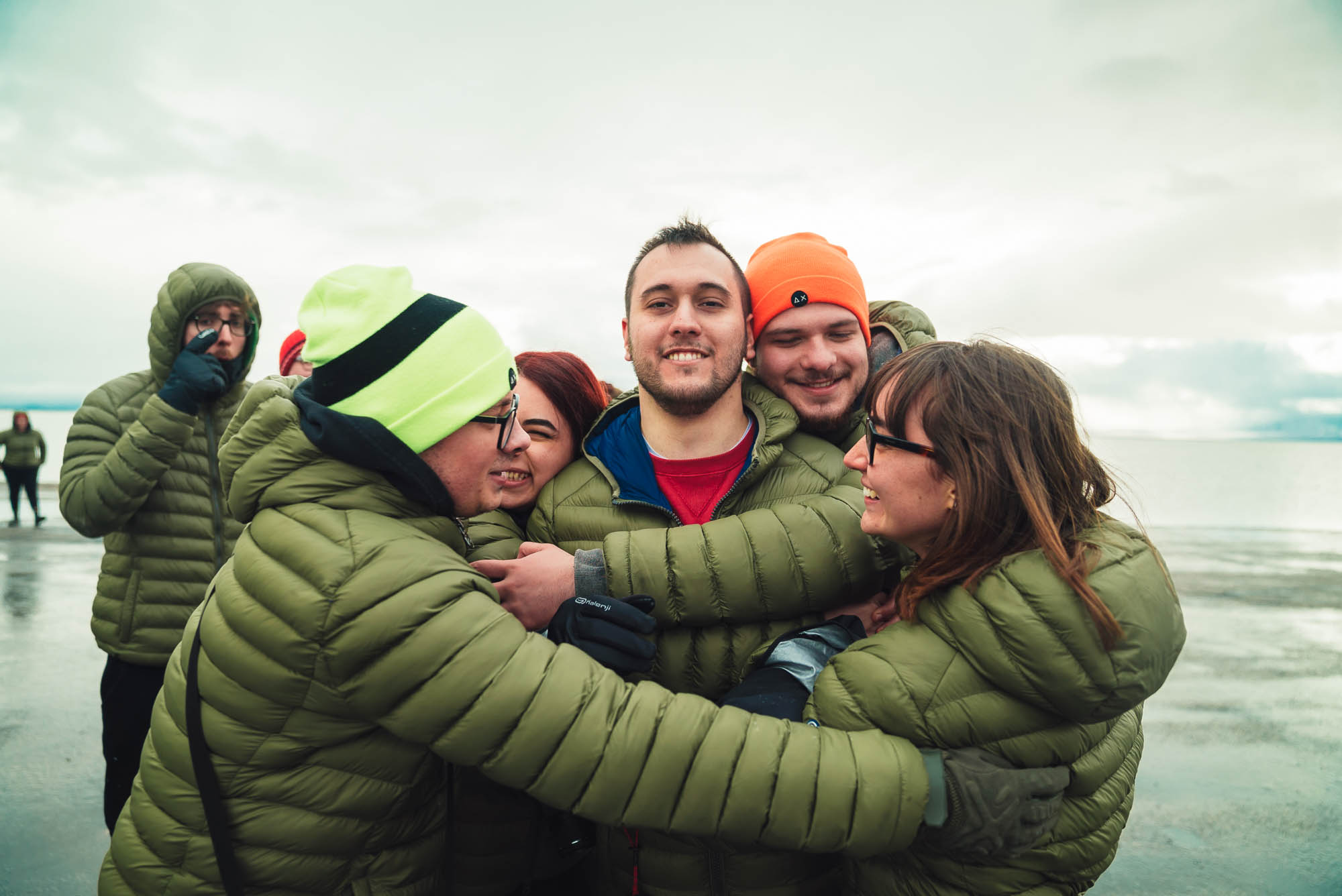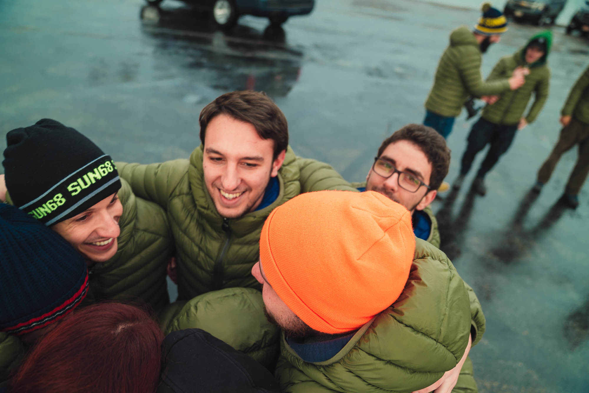 Ci abbracciamo, cerchiamo di scaldarci le mani uno con l’altro, ci facciamo gli scherzi, mentre gli altri prendono le auto e fanno gli idioti nell’acqua.