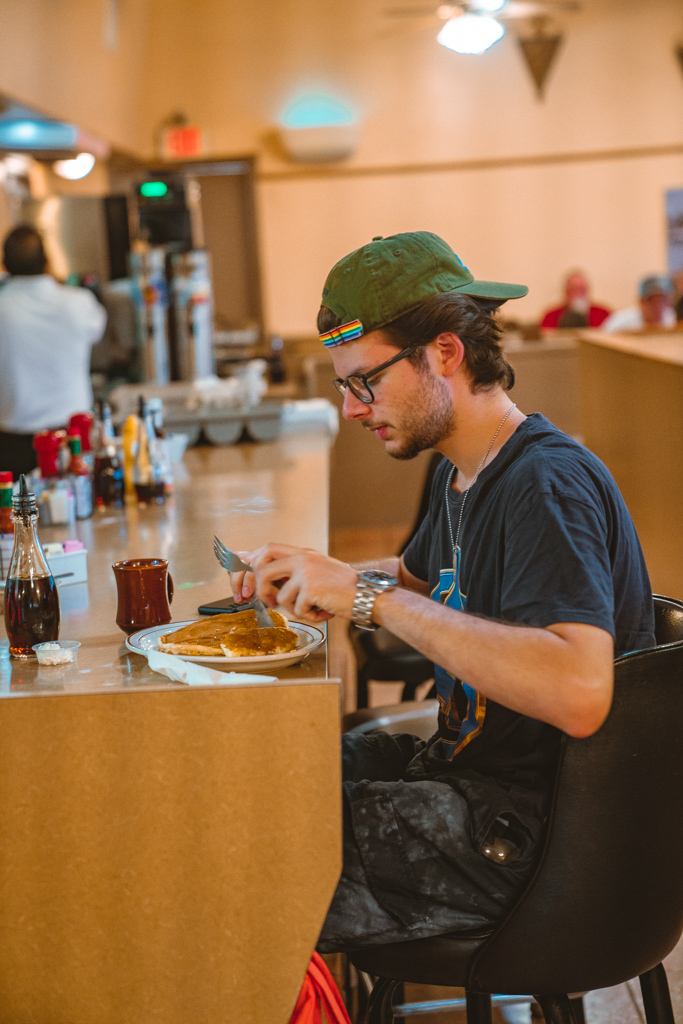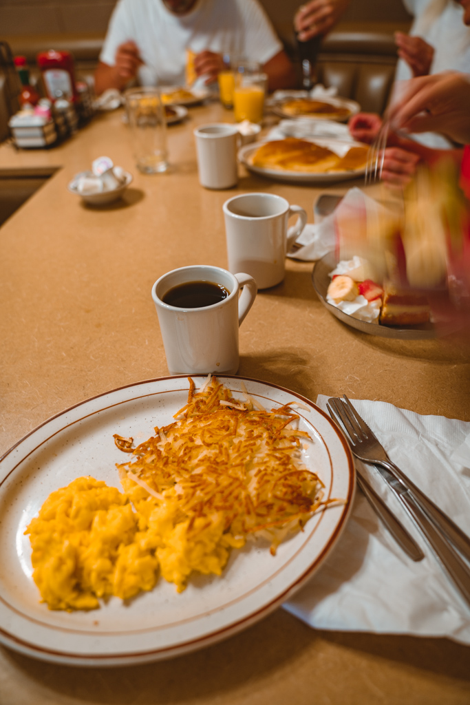 Facciamo colazione tipica americana in un vecchio diner accanto all’albergo, assieme ad altre decine di famiglie indigene che, dall’aspetto, adorano passare il sabato mattina a ingozzarsi.